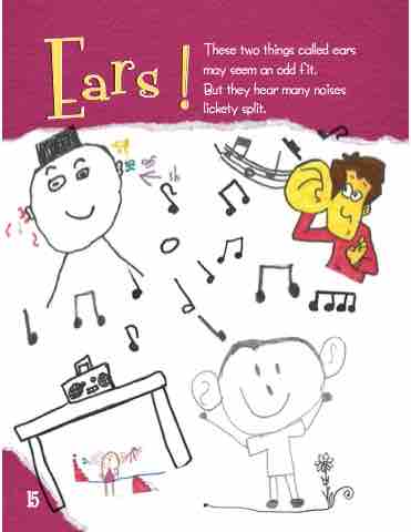 Ears ! These two things called ears may seem an odd fit. But they hear many noises lickety split. 15