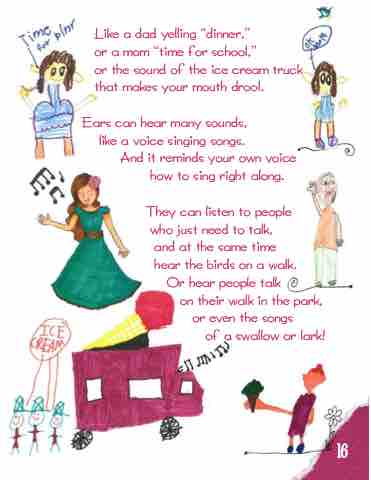 Ears can hear many sounds, like a voice singing songs.